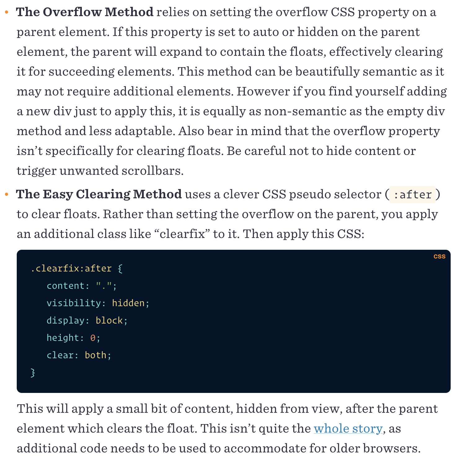 - To prevent strange layout issues, clear the float after other floated but before the end of the container