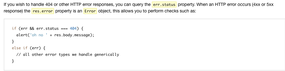 Superagent considers 4xx and 5xx responses errors by default, but if you wish to handle 404 or other HTTP errors, you can use the