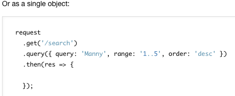 .query()method accepts objects (also single strings or joined strings) and when used withget()will form a query string. You can also use.query()for HEAD requests. Below is an example of a single object: