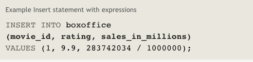 VALUESfor the INSERT are listed in parentheses.-