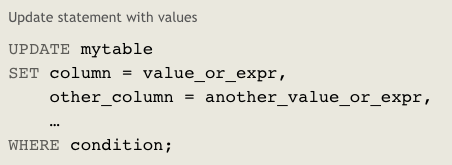 UPDATEqueries update rows in the database.Note: Always use a