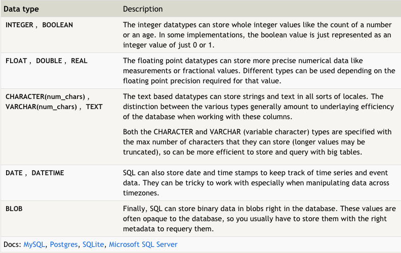 Below are some of the common data types available for columns: