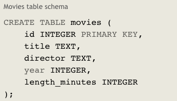 - A “schema” describes the structure of the table and data types of each column. For example, the year column should be an integer and the title should be a string.